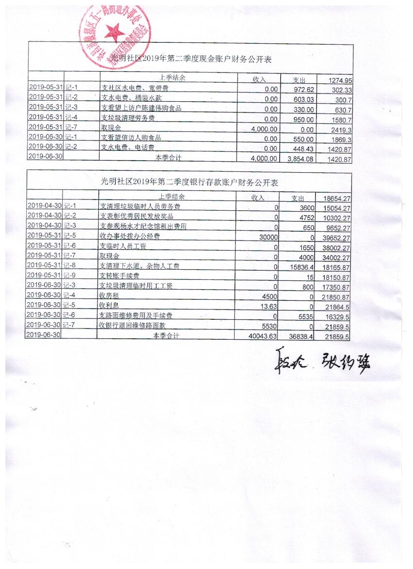 五一路办事处光明社区2019年第二季度现金、银行存款账户公开表