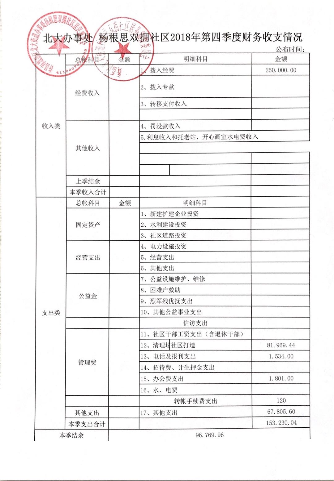 北大办事处杨根思双拥社区2018年第四季度财务公开表