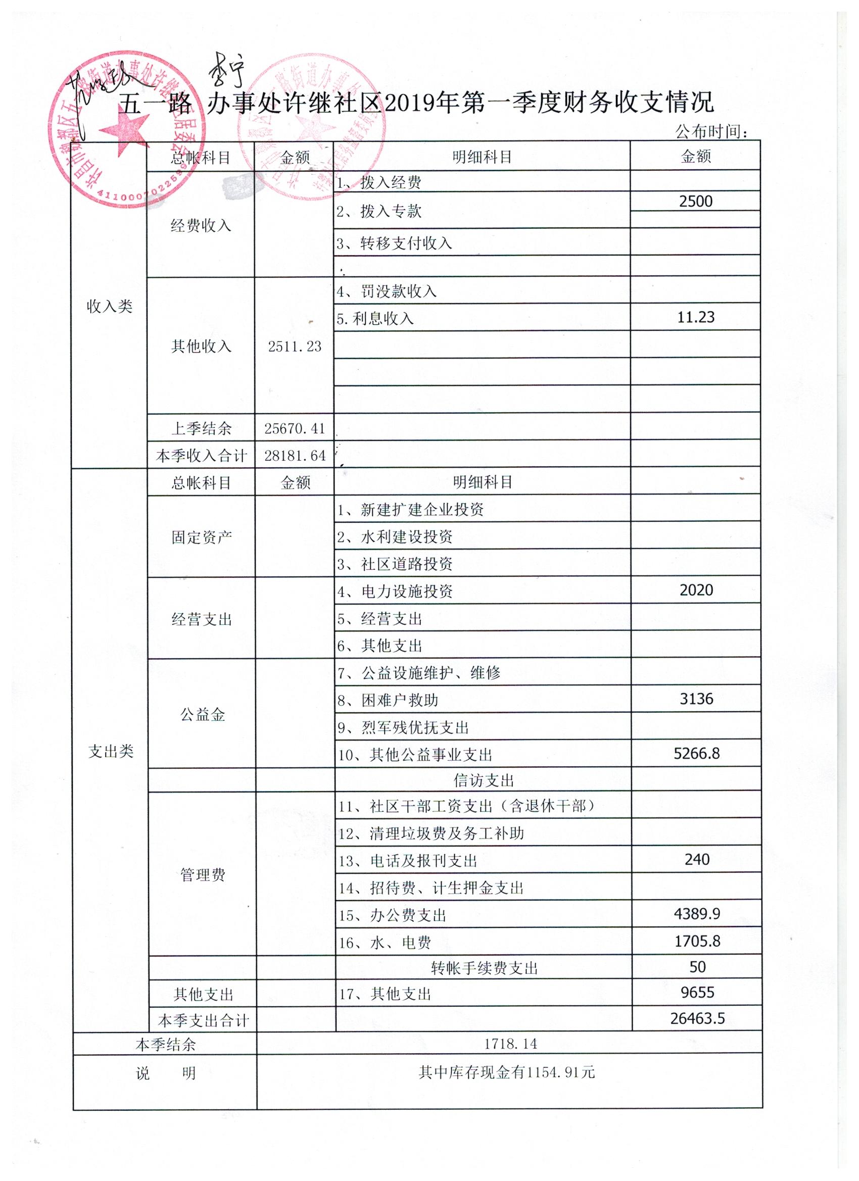 五一路办事处许继社区2019年第二季度现金、银行存款账户公开表
