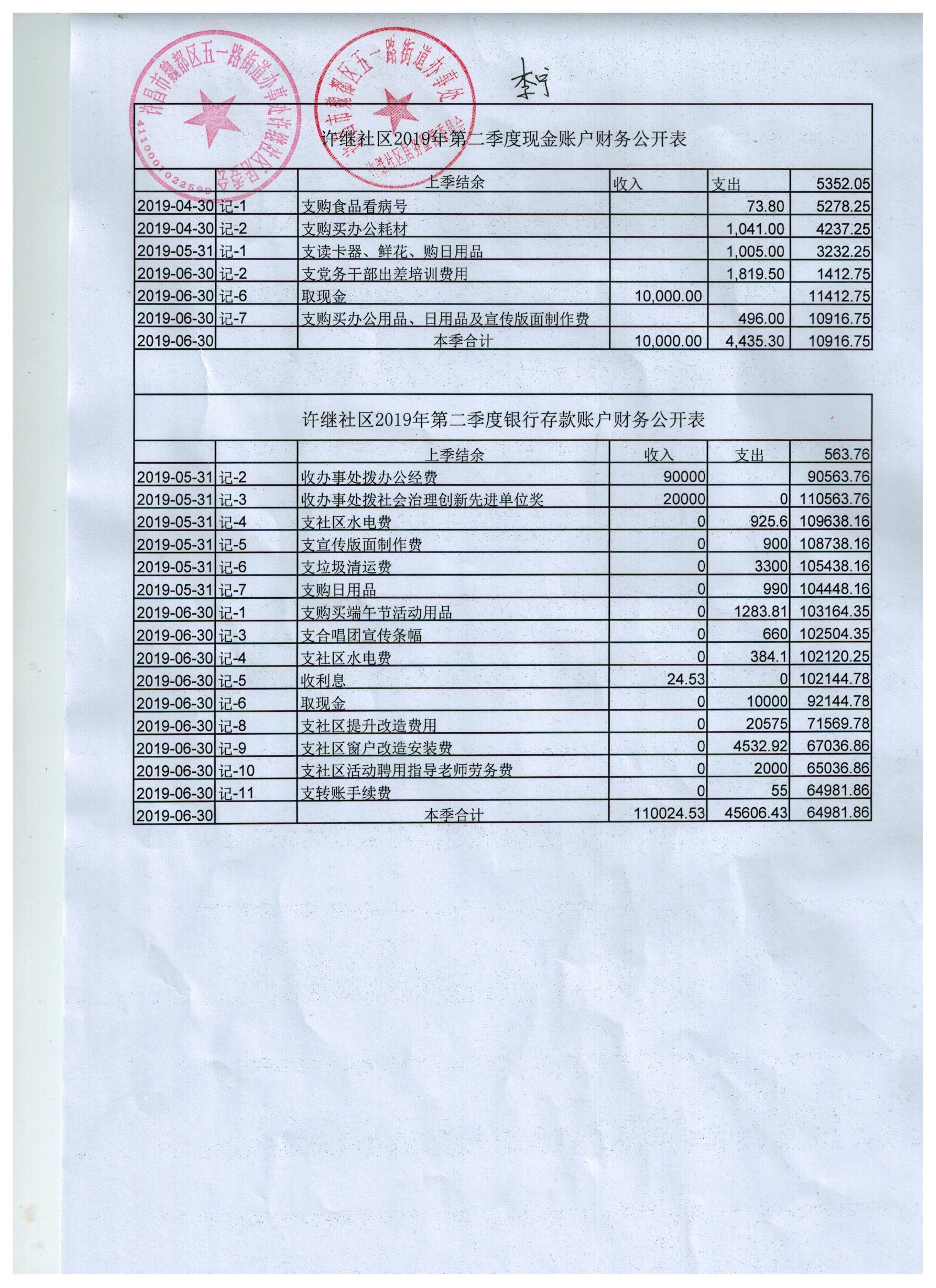 五一路办事处许继社区2019年第二季度现金、银行存款账户公开表