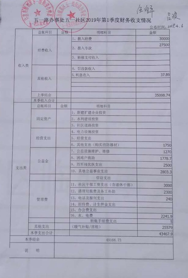 五一路办事处五一社区2019年第一季度财务公开表