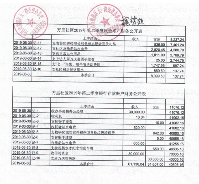 五一路办事处万里社区2019年第二季度现金、银行存款账户公开表